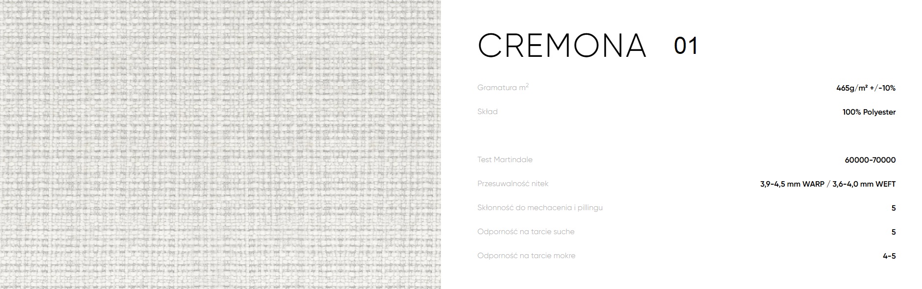 To materiał nie tylko stylowy, ale również praktyczny – dzięki wysokiej odporności na ścieranie (test Martindale’a), Cremona sprawdzi się doskonale w codziennym użytkowaniu. Tkanina ta jest przyjemna w dotyku, nie mechaci się, a wiele wariantów posiada także właściwości ułatwiające czyszczenie, co czyni ją doskonałym wyborem do salonów, sypialni i pokojów dziennych.