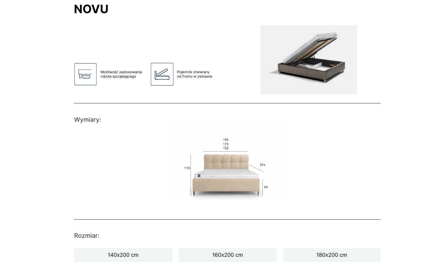 Co ważne – łóżko Novu wyposażone jest w pojemny pojemnik na pościel, który znajduje się pod stelażem. To praktyczne rozwiązanie pozwala na wygodne przechowywanie kołder, poduszek czy dodatkowej pościeli, pomagając utrzymać porządek w sypialni.