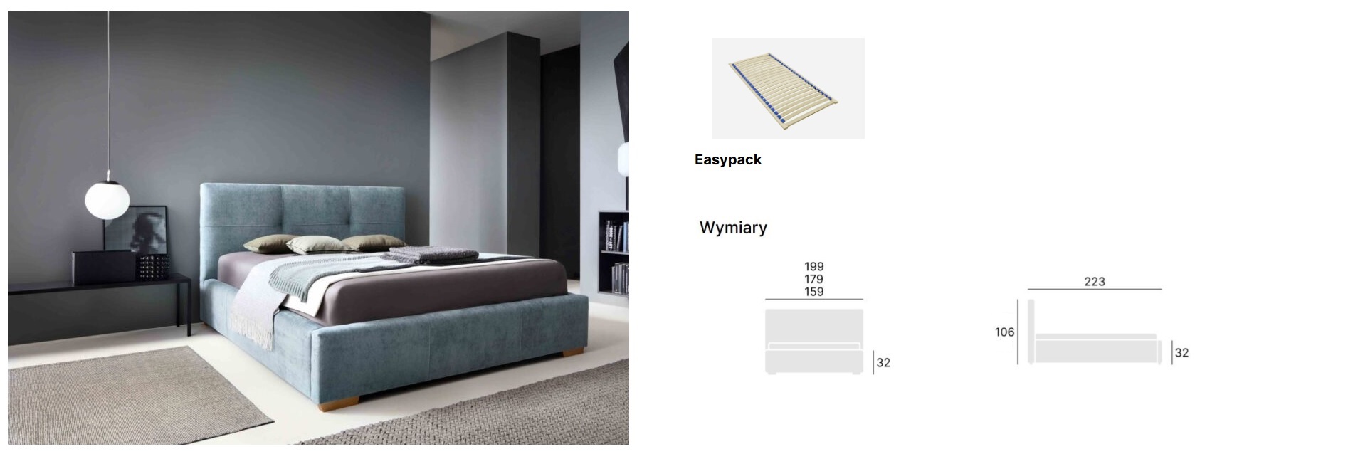 Dla maksymalnej wygody, łóżko oferowane jest w zestawie ze stelażem i materacem, co oznacza, że nie musisz szukać dodatkowych elementów – otrzymujesz gotowe rozwiązanie zapewniające komfortowy sen od pierwszej nocy.
