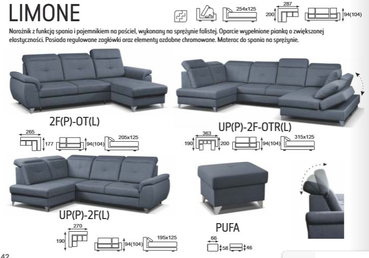 Na stronie prezentujemy narożnik Limone w układzie OTR-2F, czyli z praktycznym szezlongiem oraz pełnowymiarową funkcją spania typu delfin.