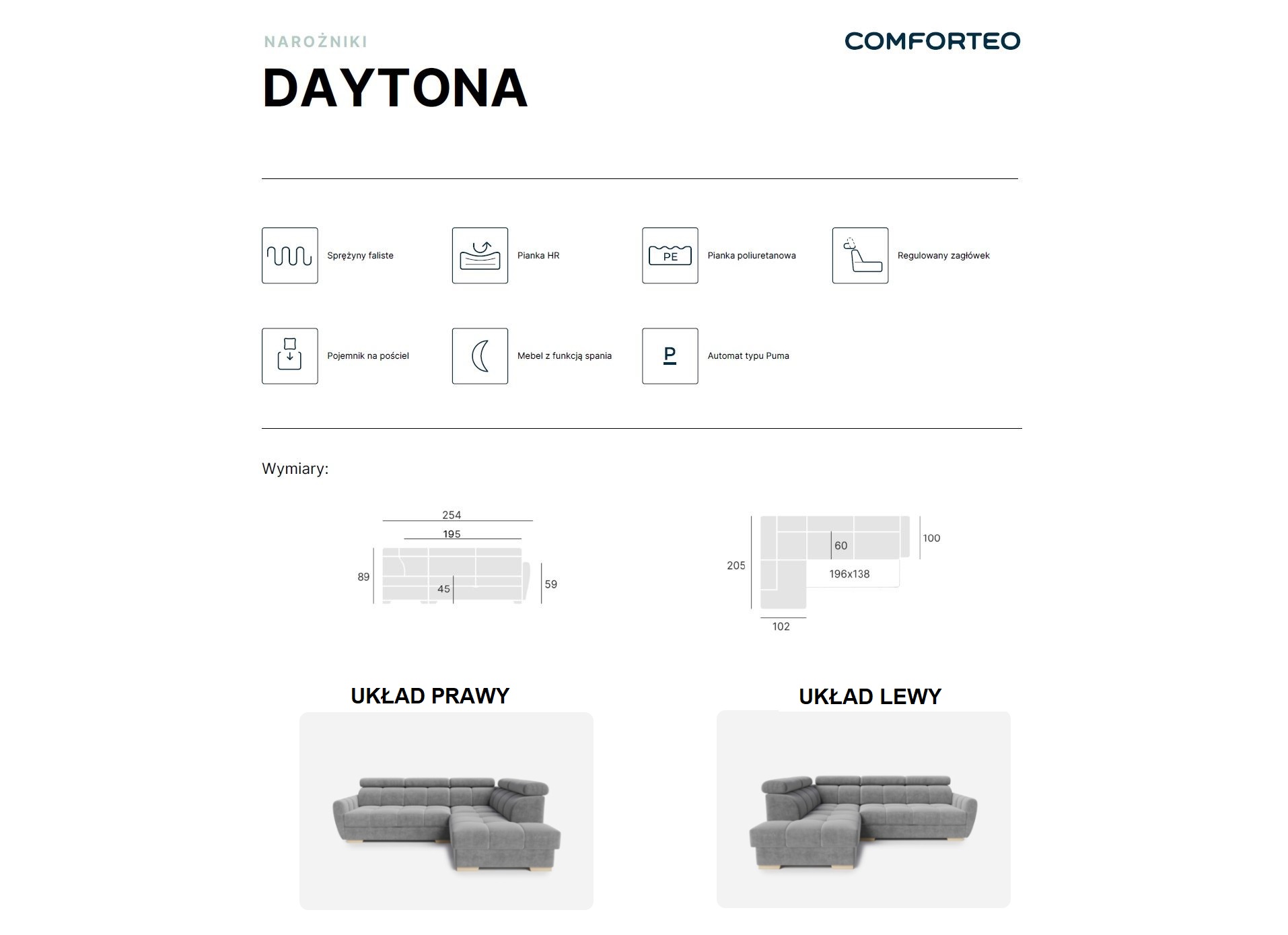 Dzięki zastosowaniu wysokiej jakości materiałów – pianki wysokoelastycznej i sprężyn falistych – narożnik Daytona zapewnia wygodę zarówno podczas siedzenia, jak i snu. Możliwość wyboru tkaniny i koloru nóżek pozwala na pełną personalizację mebla, dostosowaną do stylu wnętrza.