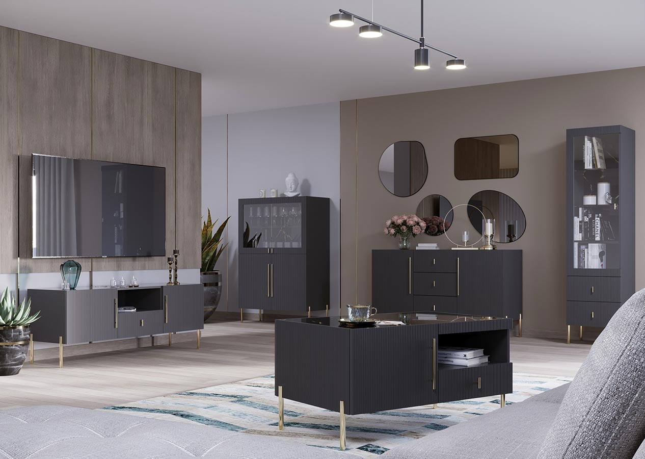 - Błysk i połysk: Fronty mebli często są lakierowane na wysoki połysk, lustrzane lub zdobione metalicznymi akcentami.